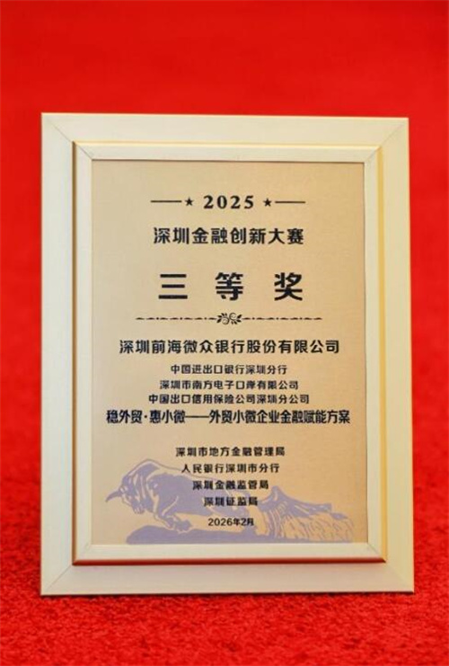近日,由深圳市地方金融管理局、人民银行深圳市分行、深圳金融监管局、深圳证监局联合主办的2025深圳金融创新大赛成果展示暨颁奖活动圆满举行。微众银行企业金融凭借服务外贸小微企业的“微贸贷”金融赋能方案、与深圳征信合作开展的培育早期科技企业的“科技初创通”项目双双荣获三等奖,两项创新成果获监管部门与行业权威认可,彰显数字金融服务实体经济的突出成效。